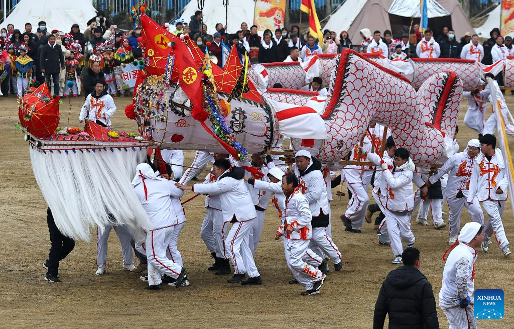 A dragon dance performance is staged in Luoshan Village of Hefeng Town in Lishui District of Nanjing, east China's Jiangsu Province, Feb. 5, 2024. (Photo by Xin Yi/Xinhua)