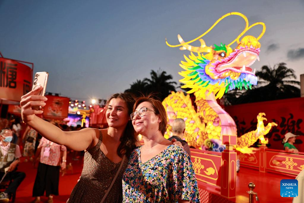 Tourists take selfies with a lantern in Sanya, south China's Hainan Province, Feb. 5, 2024. (Photo by Yuan Yongdong/Xinhua)