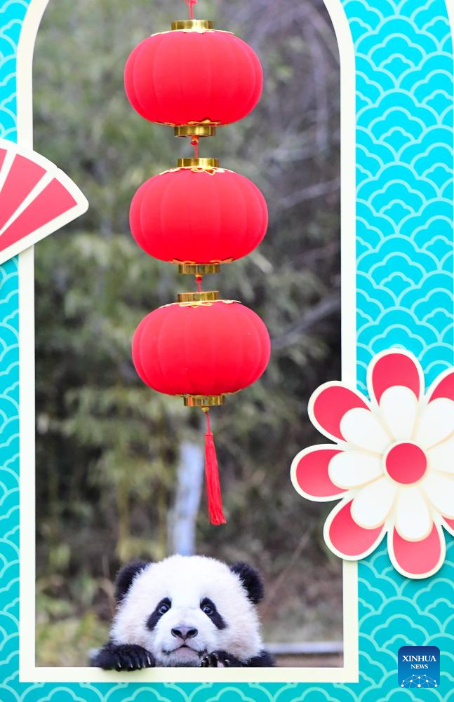 A giant panda cub is seen at the Chengdu Research Base of Giant Panda Breeding in Chengdu, southwest China's Sichuan Province, Feb. 2, 2024.?(Chengdu Research Base of Giant Panda Breeding/Handout via Xinhua)