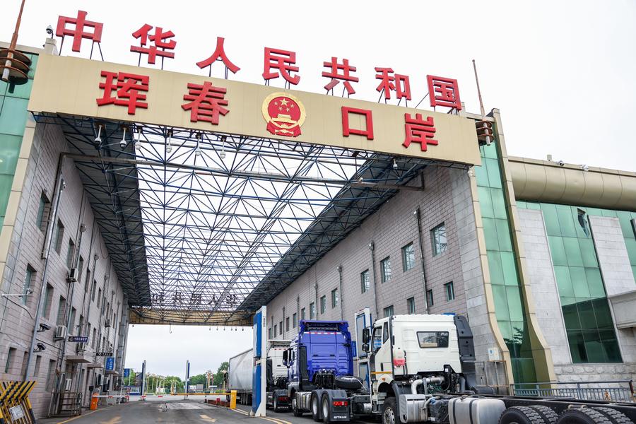 Trucks wait to pass the highway port in Hunchun City, northeast China's Jilin Province, June 26, 2023. (Xinhua/Yan Linyun)