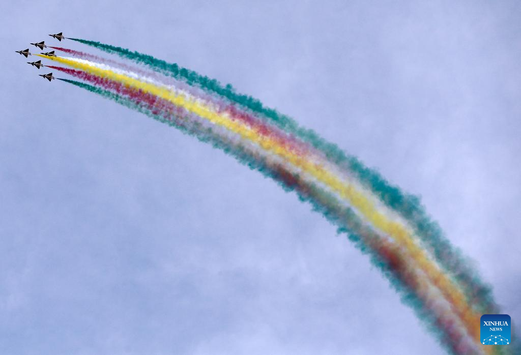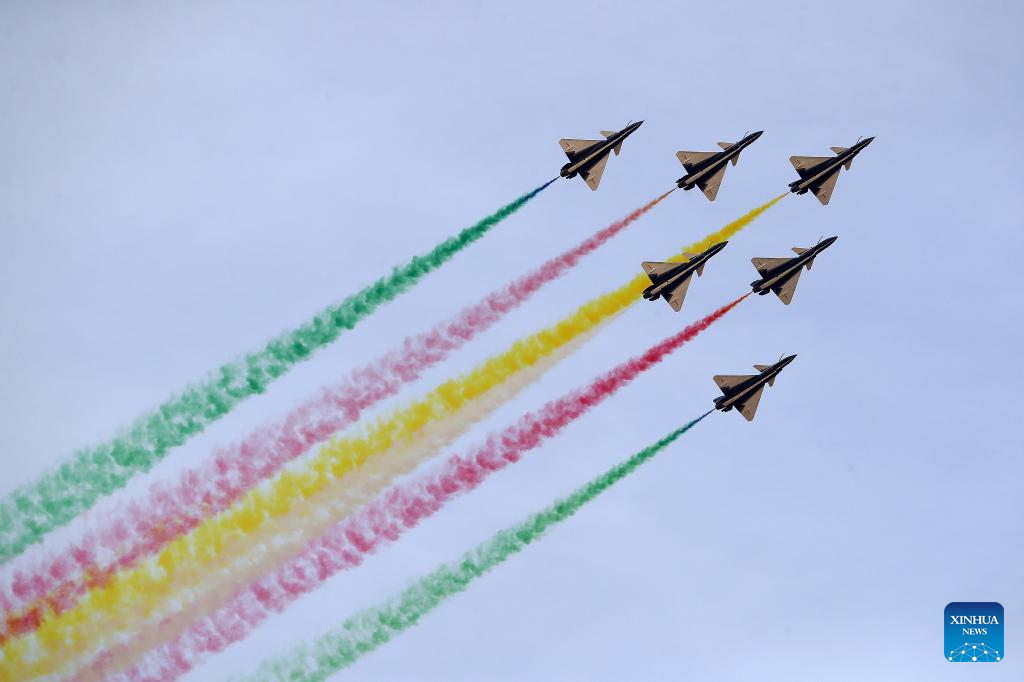 Aircraft of the Bayi Aerobatic Team of the Chinese People's Liberation Army (PLA) Air Force present an air show during the second edition of the World Defense Show in Riyadh, Saudi Arabia, on Feb. 5, 2024.?(Xinhua/Wang Dongzhen)