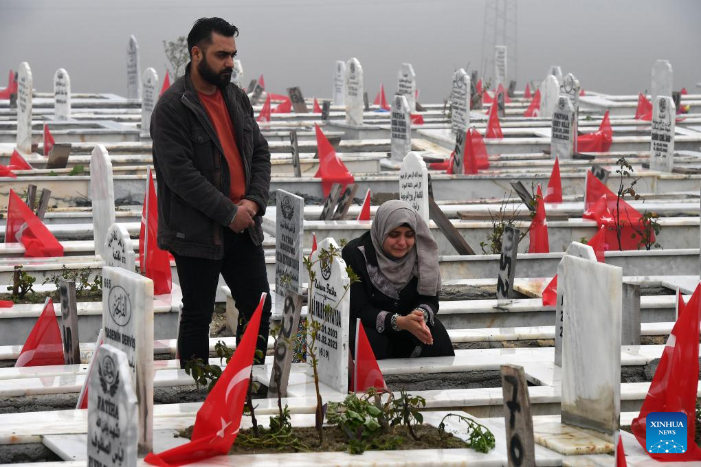 People mourn their relatives who died in the earthquakes at a cemetery in Hatay, Türkiye, on Feb. 6, 2024. A year ago, Türkiye suffered the worst disaster in its modern history when twin earthquakes rocked its southern region, killing more than 53,000 people and displacing millions. (Photo by Mustafa Kaya/Xinhua)
