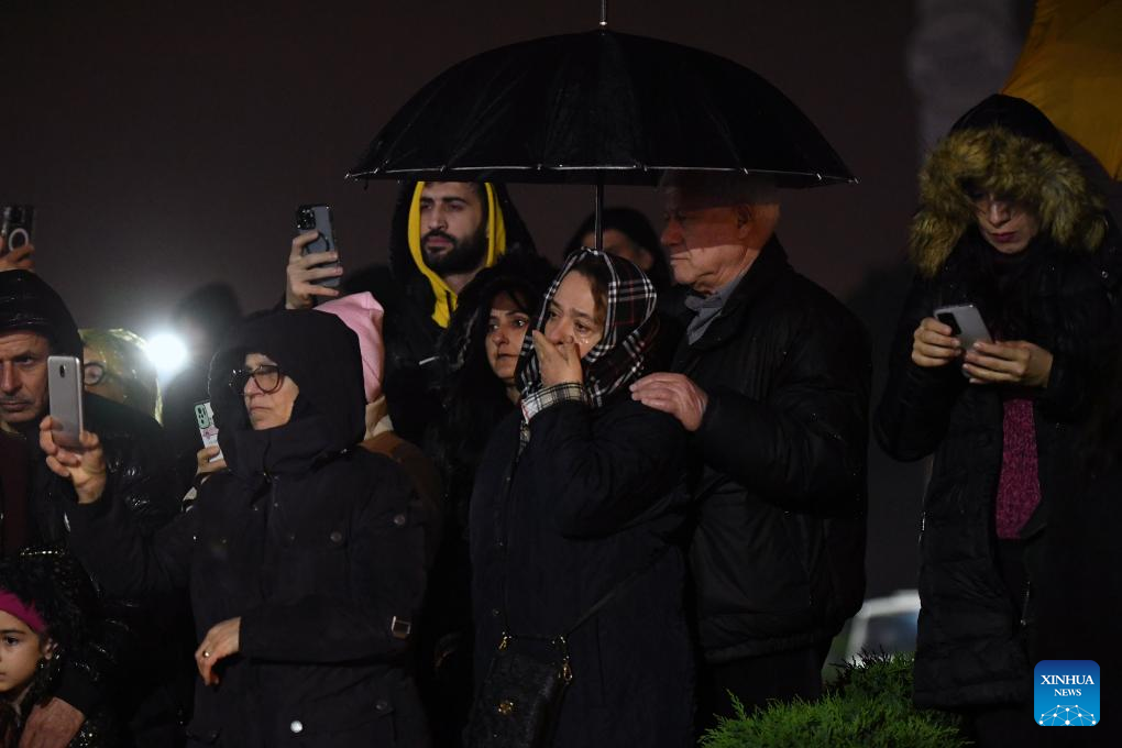 People mourn victims of the earthquakes in Hatay, Türkiye, on Feb. 5, 2024. A year ago, Türkiye suffered the worst disaster in its modern history when twin earthquakes rocked its southern region, killing more than 53,000 people and displacing millions. (Photo by Mustafa Kaya/Xinhua)
