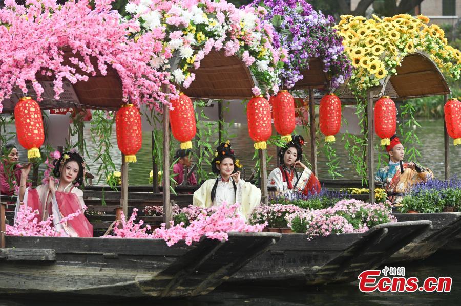 Women dressed in traditional Hanfu costumes take part in a cruise parade at the 14th floating flower market, a unique tradition during China's Spring Festival on Liwan Lake in Guangzhou, south China's Guangdong Province, Feb. 6, 2024. (Photo: China News Service/Chen Chuhong)