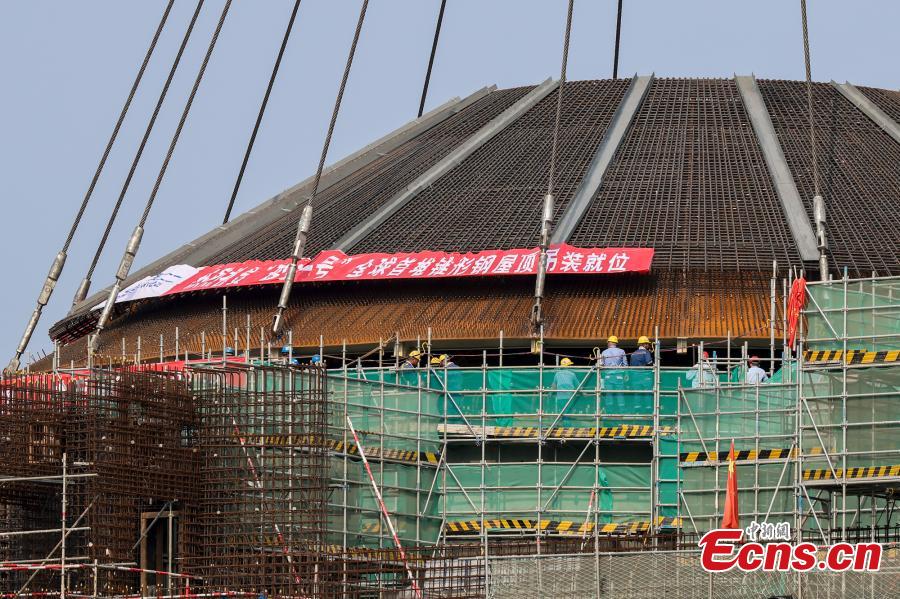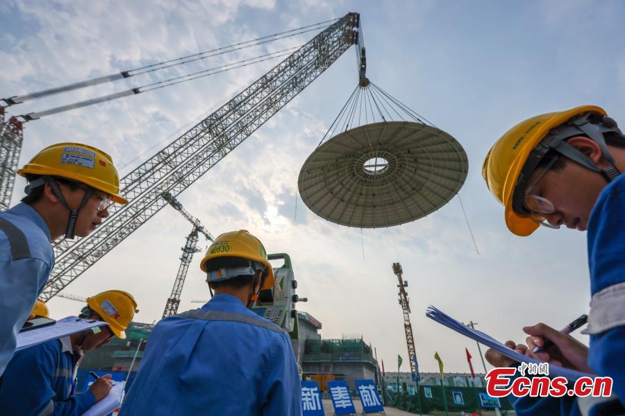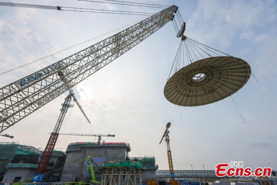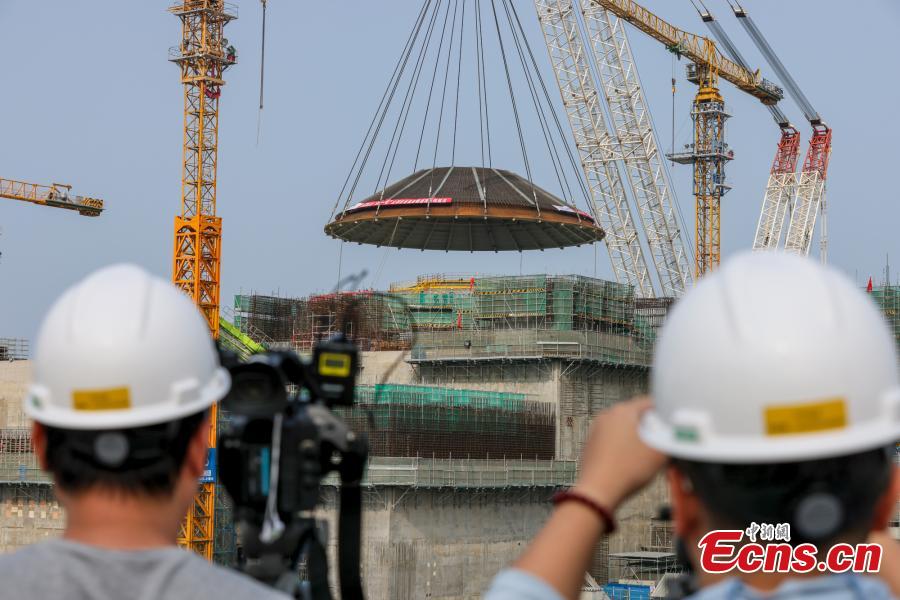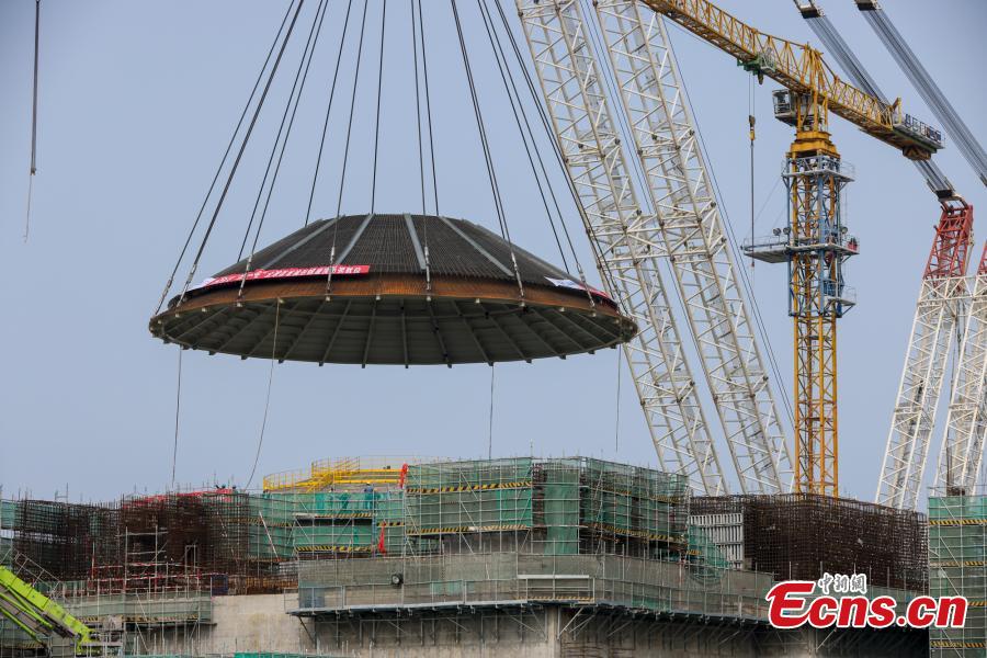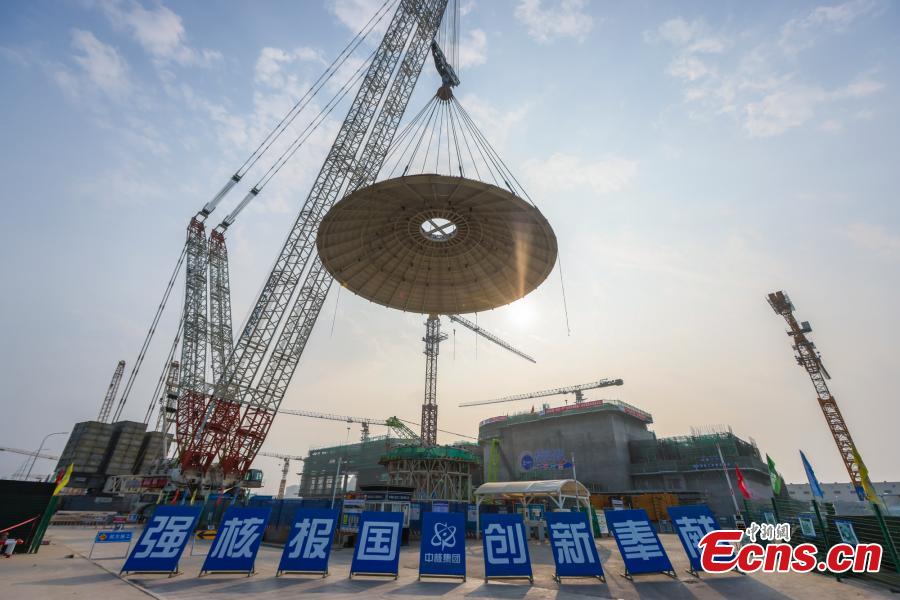 The 550-ton outer dome installation on the world's first commercial small modular reactor was completed on Tuesday, marking the completion of the main structure. Linglong One can generate 1 billion kilowatt-hours of electricity per year once completed, which can enable the need of 526,000 households.