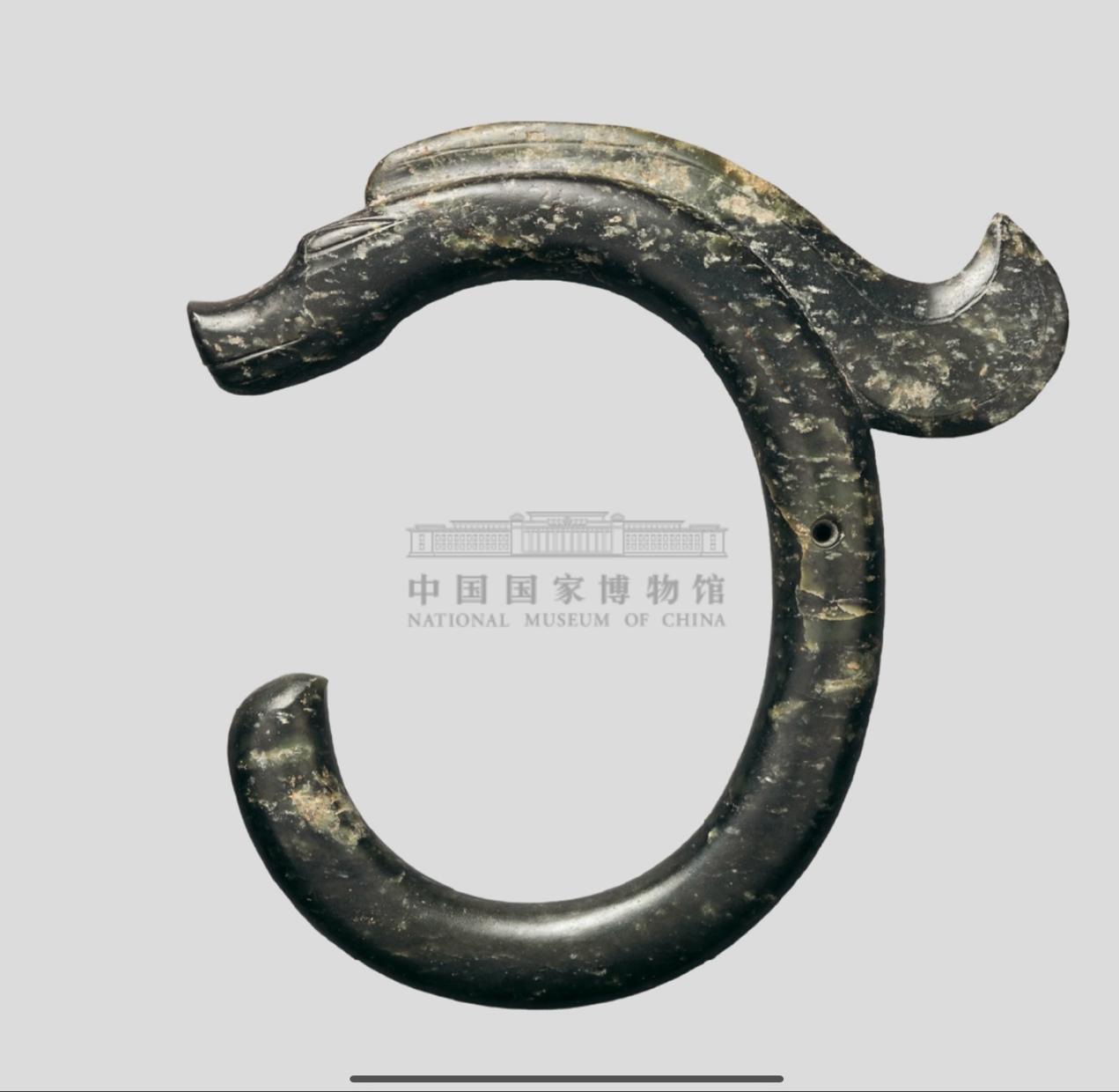 Opinions on the origin of the loong vary, with suggestions including lizards and crocodiles. It is suggested that the loong's head may derive from that of a horse, cow, or pig. The jade loong is among the earliest depictions of a loong discovered in China. The head features a long snout and a protruding nose with an upturned edge. The end is truncated, displaying two side-by-side nostrils, which gives it characteristics resembling a pig's head. Crafted from black and green jade, the jade loong holds significant artistic value.