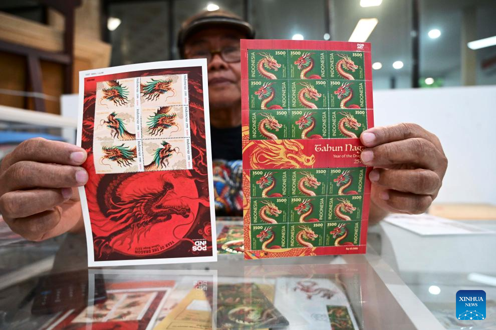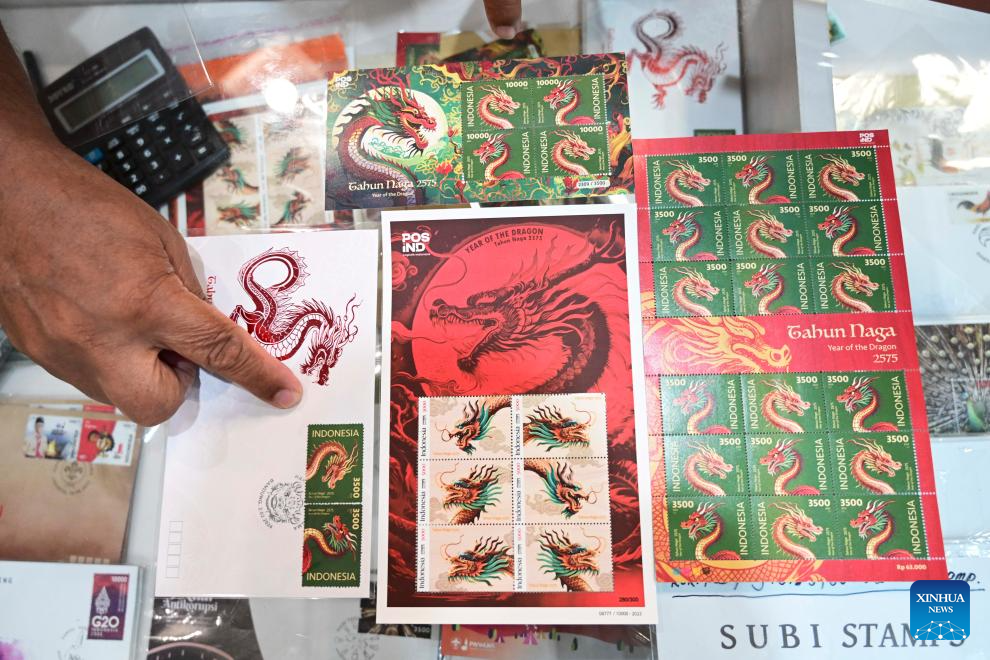 Series of postage stamps in celebration of the upcoming Chinese Lunar New Year, or the Year of the Dragon, are seen at a PT Pos Indonesia office in Jakarta, Indonesia, Feb. 6, 2024. The stamps were issued by Indonesian state-owned postal service company PT Pos Indonesia and the country's Ministry of Communications and Informatics on Friday. (Xinhua/Zulkarnain)