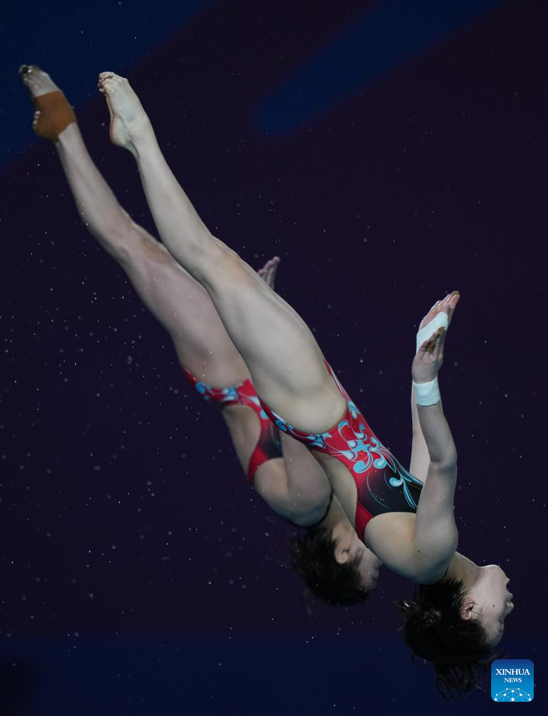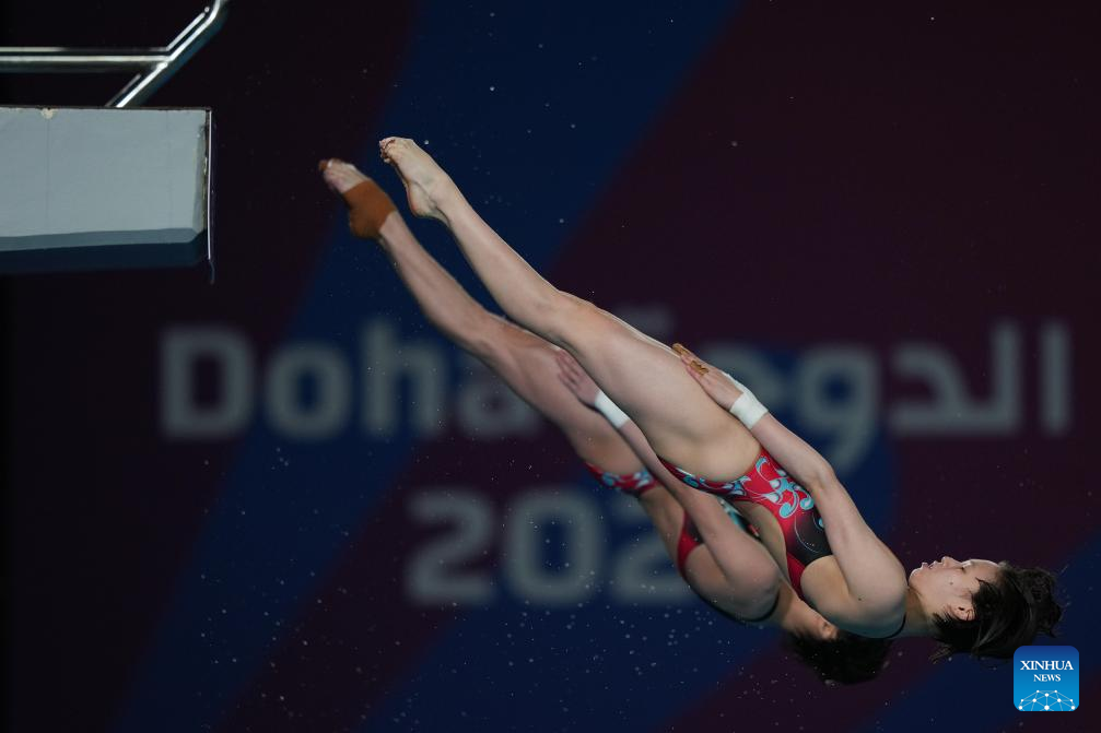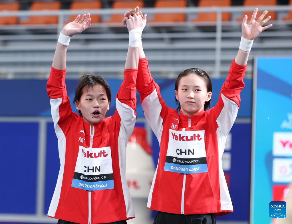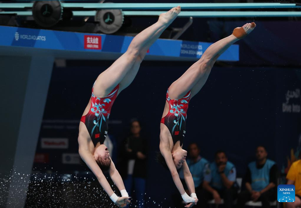 Chen Yuxi (R)/ Quan Hongchan of China compete during the women's 10m platform synchronised final of diving at the World Aquatics Championships 2024 in Doha, Qatar, Feb. 6, 2024. (Xinhua/Xue Yuge)