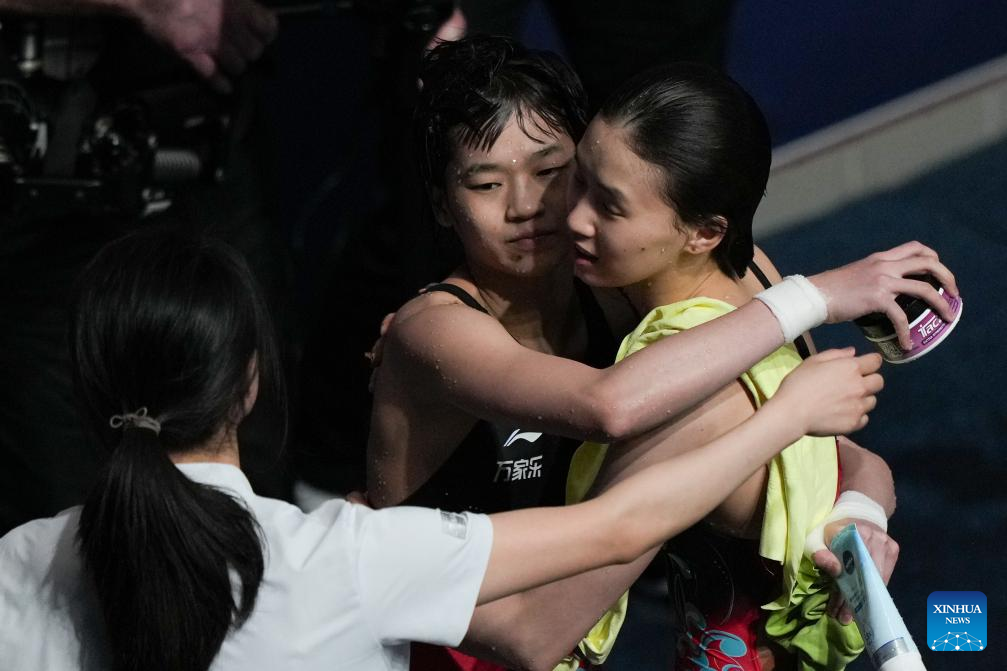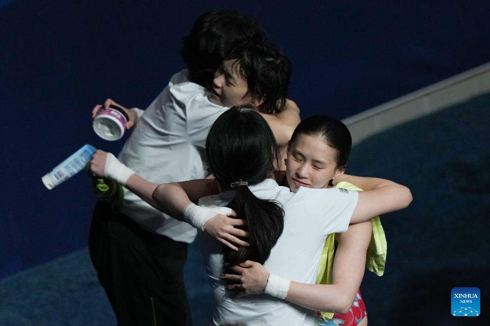 Chen Yuxi (R) hugs Quan Hongchan (C) of China after the women's 10m platform synchronised final of diving at the World Aquatics Championships 2024 in Doha, Qatar, Feb. 6, 2024. (Xinhua/Xue Yuge)