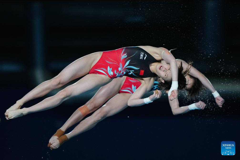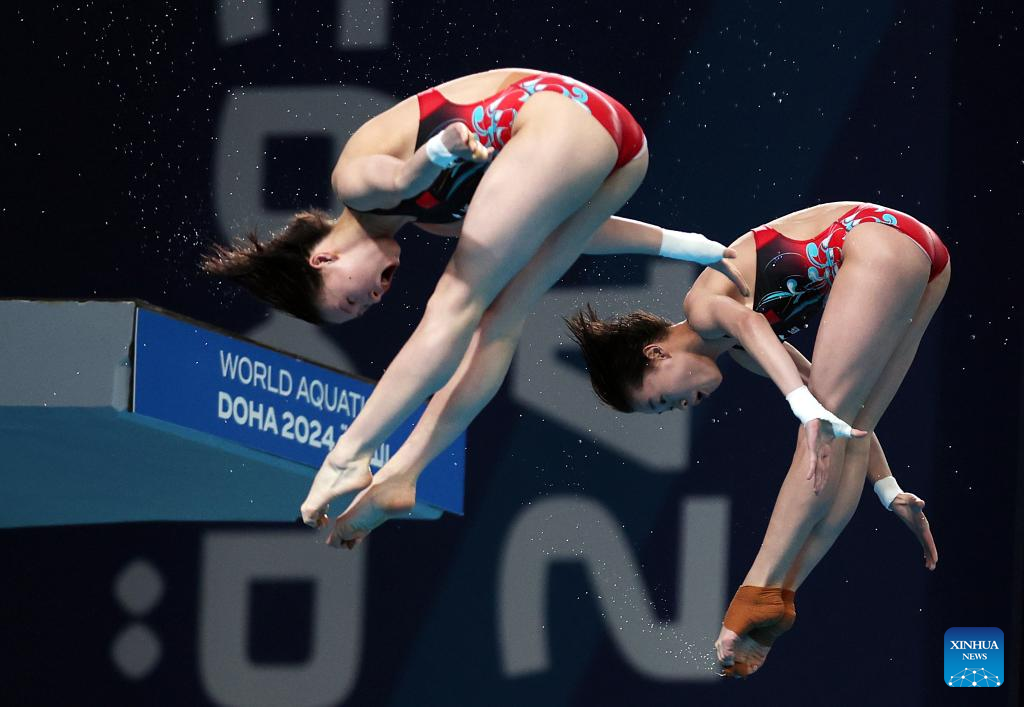 Chen Yuxi (L)/ Quan Hongchan of China compete during the women's 10m platform synchronised final of diving at the World Aquatics Championships 2024 in Doha, Qatar, Feb. 6, 2024. (Xinhua/Xue Yuge)