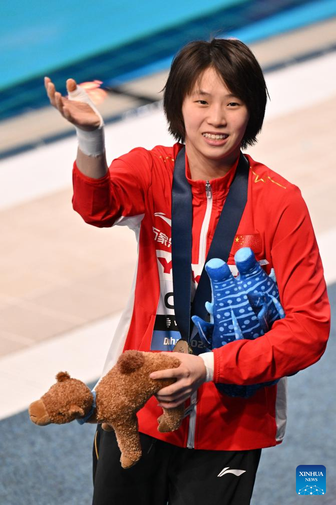 Chen Yuxi of China greets spectators after the women's 10m platform synchronised final of diving at the World Aquatics Championships 2024 in Doha, Qatar, Feb. 6, 2024. (Xinhua/Xue Yuge)