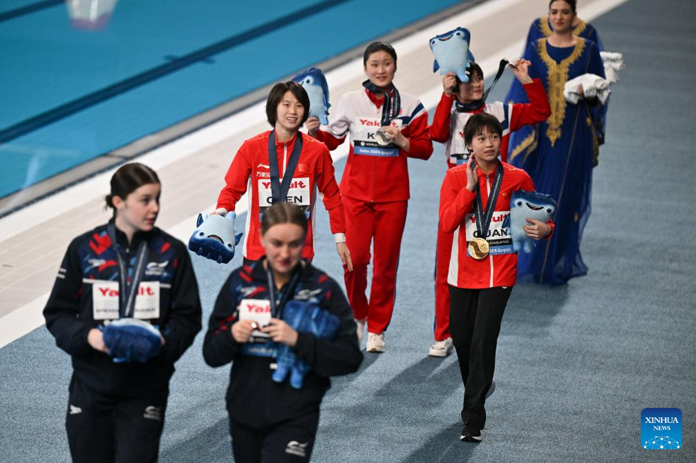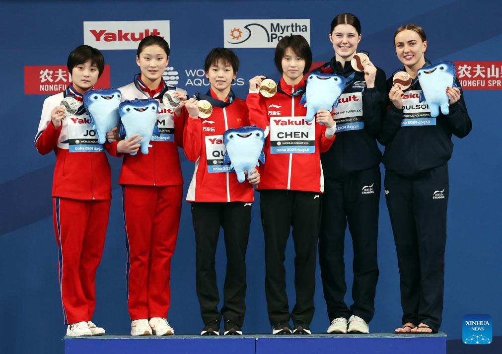Gold medalists Chen Yuxi (3rd R)/Quan Hongchan (3rd L) of China, silver medalists Kim Mi Rae (2nd L) /Jo Jin Mi (1st L) of the Democratic People's Republic of Korea (DPRK) and bronze medalists Andrea Spendolini Sirieix (2nd R)/Lois Toulson of Britain pose during the awarding ceremony for the women's 10m platform synchronised of diving at the World Aquatics Championships 2024 in Doha, Qatar, Feb. 6, 2024. (Xinhua/Luo Yuan)