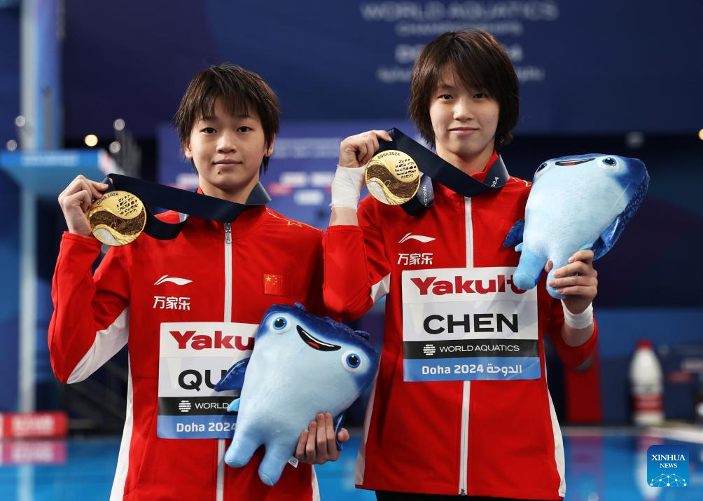 Chen Yuxi (R)/Quan Hongchan of China pose with their medals after the women's 10m platform synchronised final of diving at the World Aquatics Championships 2024 in Doha, Qatar, Feb. 6, 2024. (Xinhua/Luo Yuan)