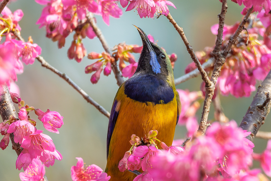 An orange-bellied leafbird forages on a cherry tree in Xiamen, southeast China's Fujian Province. (Photo/Zhou Longjie)