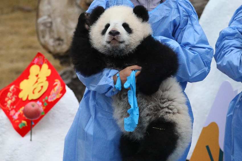 A staff member holds a giant panda cub during an event to send Chinese New Year greetings in Chengdu, southwest China's Sichuan Province. (Photo courtesy of the Chengdu Research Base of Giant Panda Breeding)