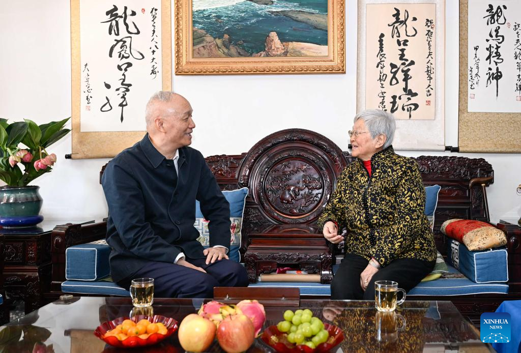 Cai Qi, a member of the Standing Committee of the Political Bureau of the Communist Party of China (CPC) Central Committee and a member of the Secretariat of the CPC Central Committee, visits space technology expert Qi Faren on Feb. 7, 2024. On behalf of the CPC Central Committee and General Secretary Xi Jinping, Cai visited several prominent figures on Wednesday morning and extended festive greetings to all people working in the culture, science and technology circles for the upcoming Chinese Lunar New Year. (Xinhua/Zhai Jianlan)