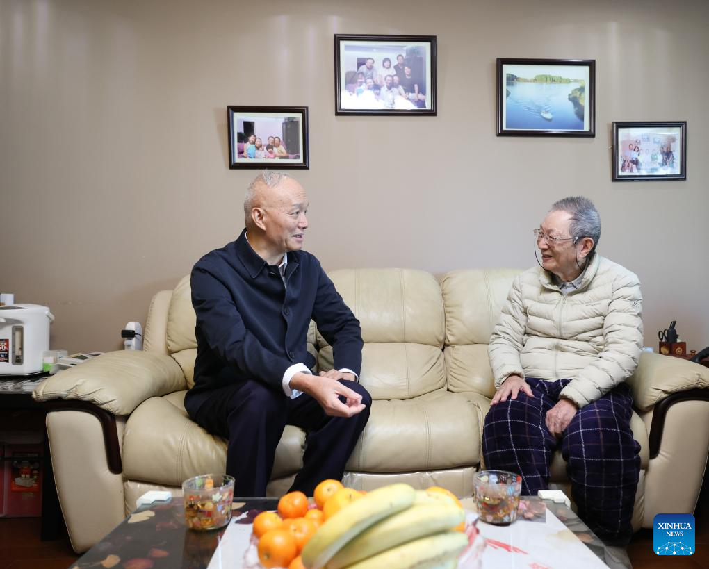 Cai Qi, a member of the Standing Committee of the Political Bureau of the Communist Party of China (CPC) Central Committee and a member of the Secretariat of the CPC Central Committee, visits economist Liu Guoguang on Feb. 7, 2024. On behalf of the CPC Central Committee and General Secretary Xi Jinping, Cai visited several prominent figures on Wednesday morning and extended festive greetings to all people working in the culture, science and technology circles for the upcoming Chinese Lunar New Year. (Xinhua/Yan Yan)