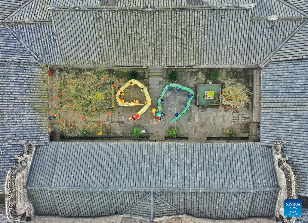 An aerial drone photo taken on Feb. 1, 2024 shows Luo Deshu performing Yutan Dragon Dance with his team members in Fangdong Town, Luxian County of southwest China's Sichuan Province. (Xinhua/Liu Kun)