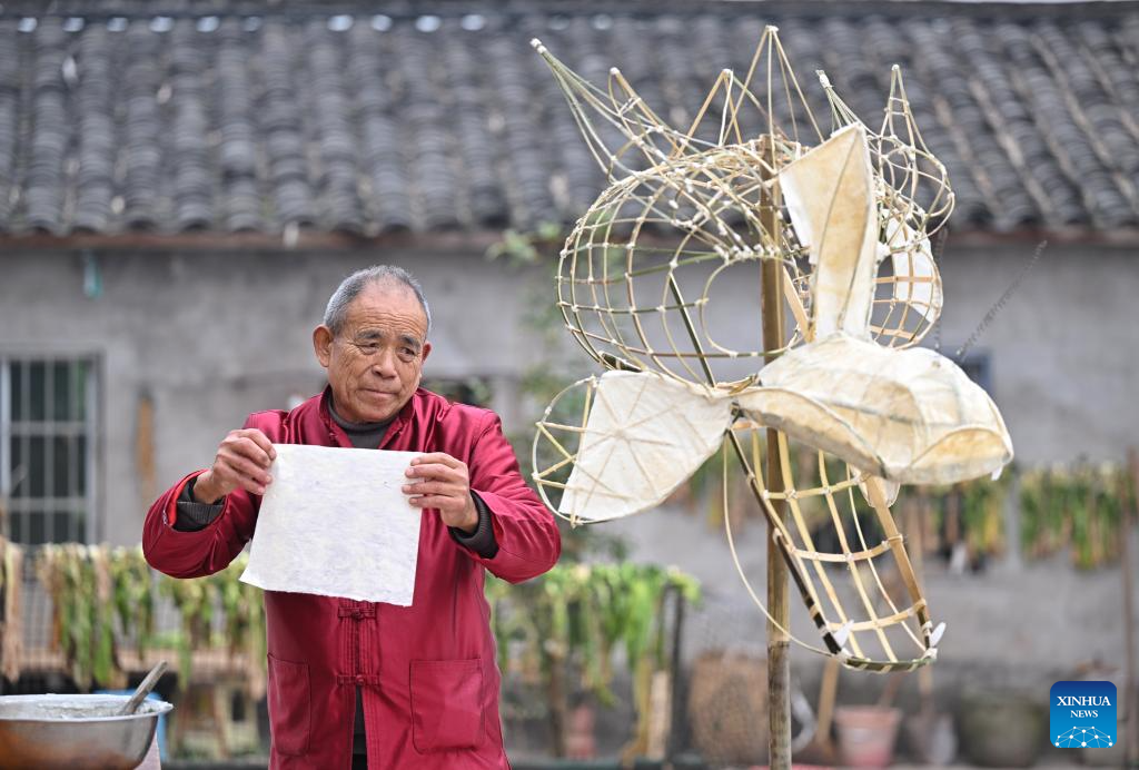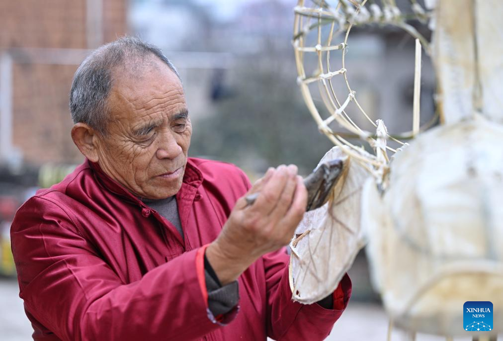 Luo Deshu makes the head of a dragon in Fangdong Town, Luxian County of southwest China's Sichuan Province, Feb. 1, 2024. (Xinhua/Liu Kun)