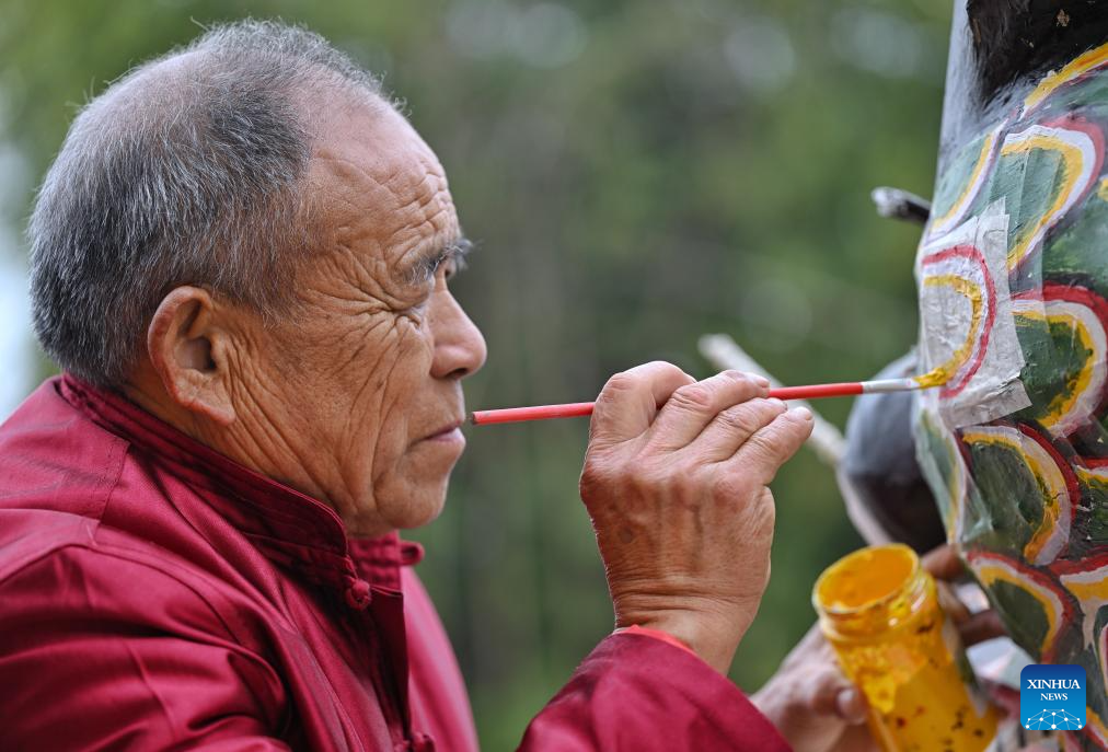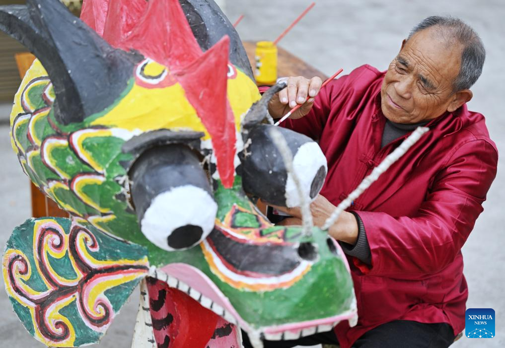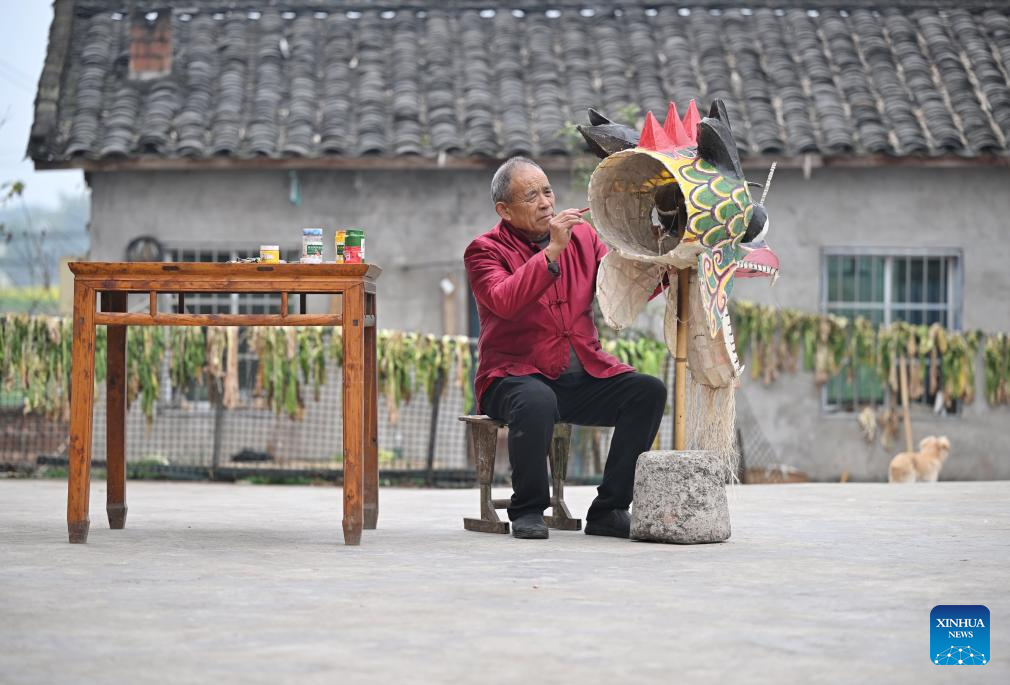 Luo Deshu paints the head of a dragon in Fangdong Town, Luxian County of southwest China's Sichuan Province, Feb. 1, 2024. (Xinhua/Liu Kun)
