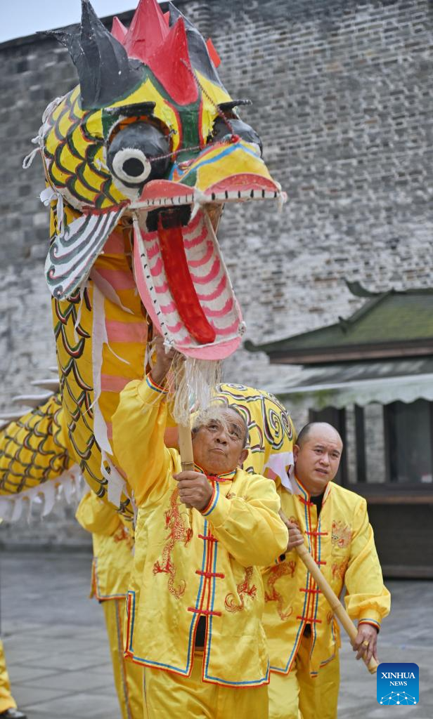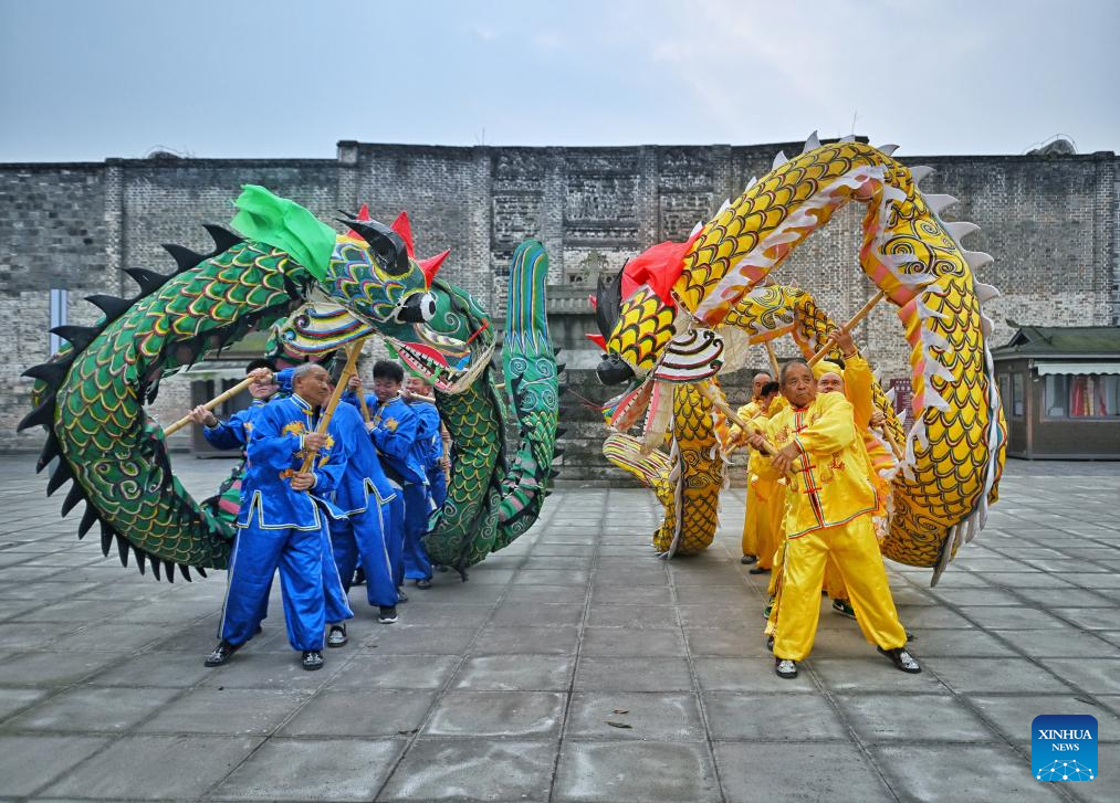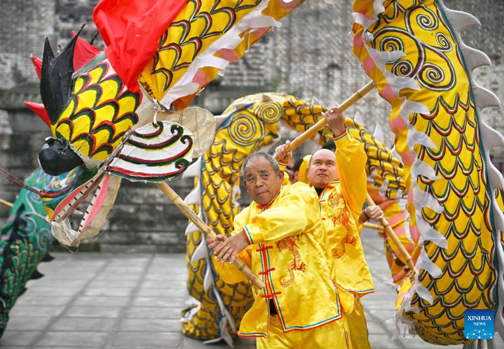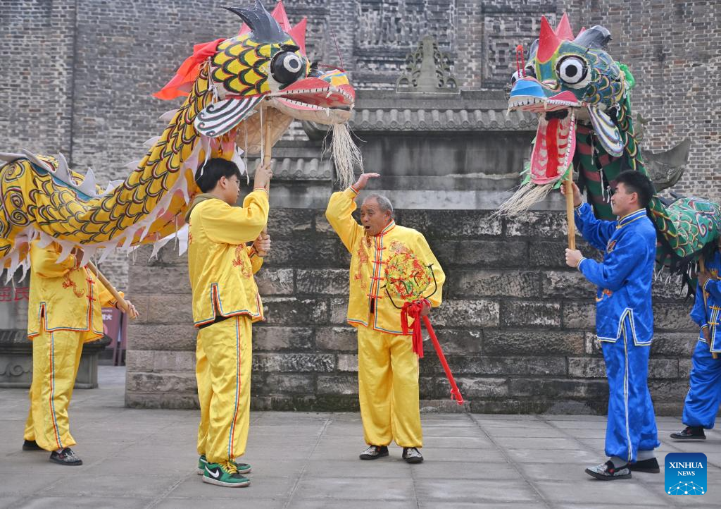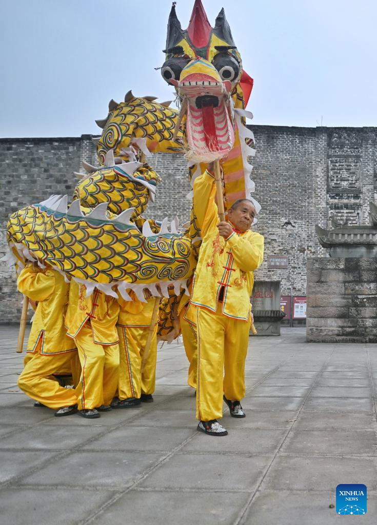 Luo Deshu performs Yutan Dragon Dance with his team members in Fangdong Town, Luxian County of southwest China's Sichuan Province, Feb. 1, 2024. (Xinhua/Liu Kun)