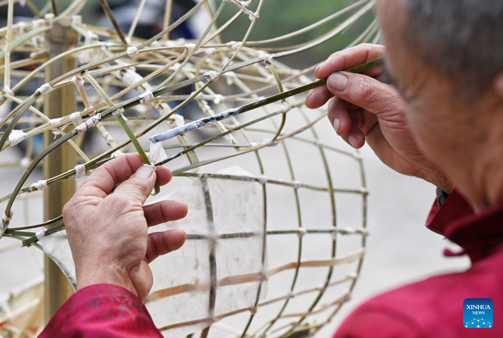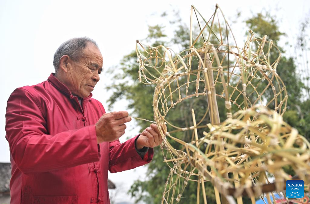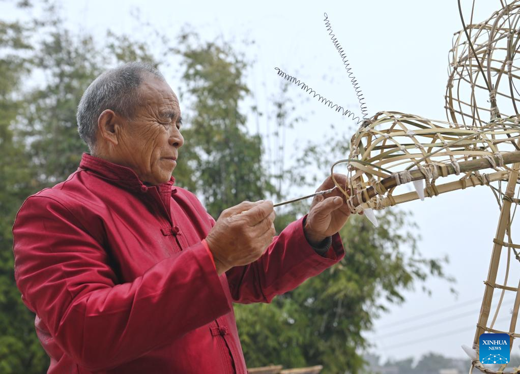 Luo Deshu makes the framework of a dragon in Fangdong Town, Luxian County of southwest China's Sichuan Province, Feb. 1, 2024. (Xinhua/Liu Kun)