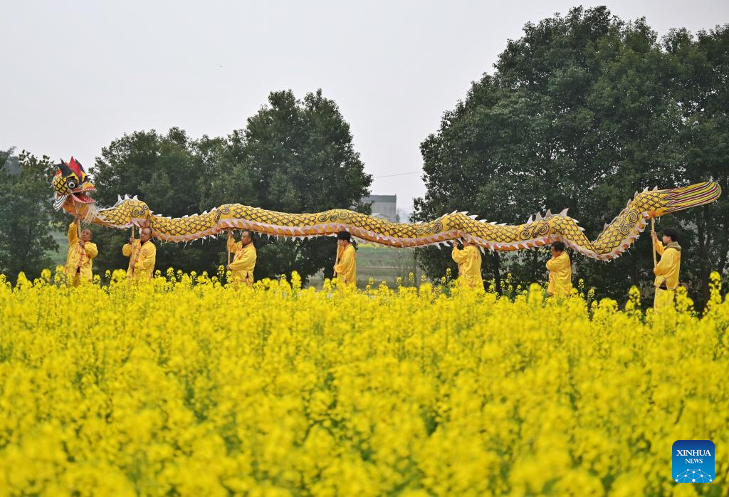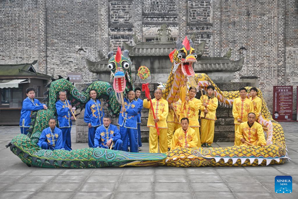 Luo Deshu (1st L) performs Yutan Dragon Dance with his team members in Fangdong Town, Luxian County of southwest China's Sichuan Province, Feb. 1, 2024. (Xinhua/Liu Kun)