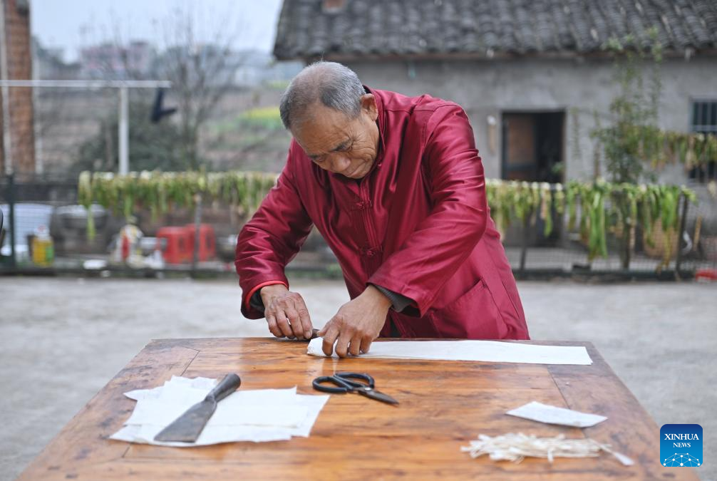 Luo Deshu cuts papers to make the head of a dragon in Fangdong Town, Luxian County of southwest China's Sichuan Province, Feb. 1, 2024. (Xinhua/Liu Kun)