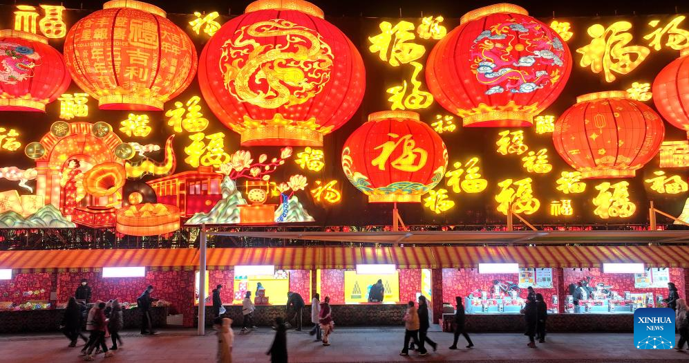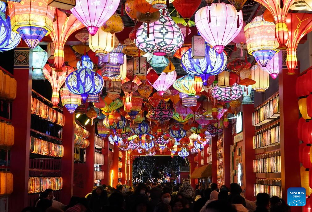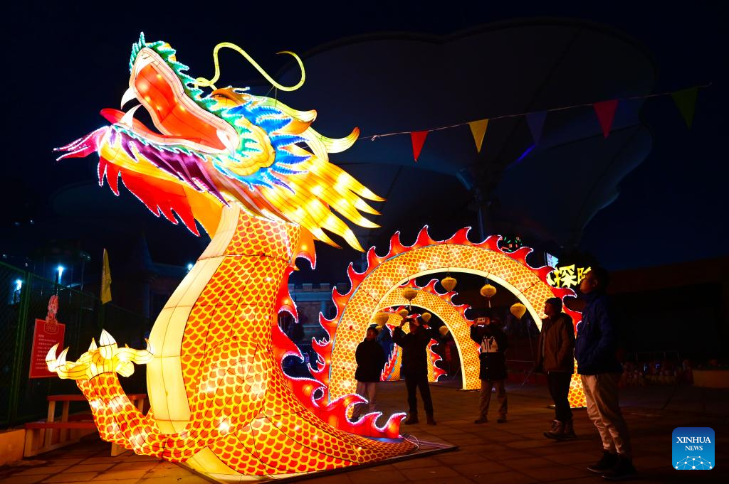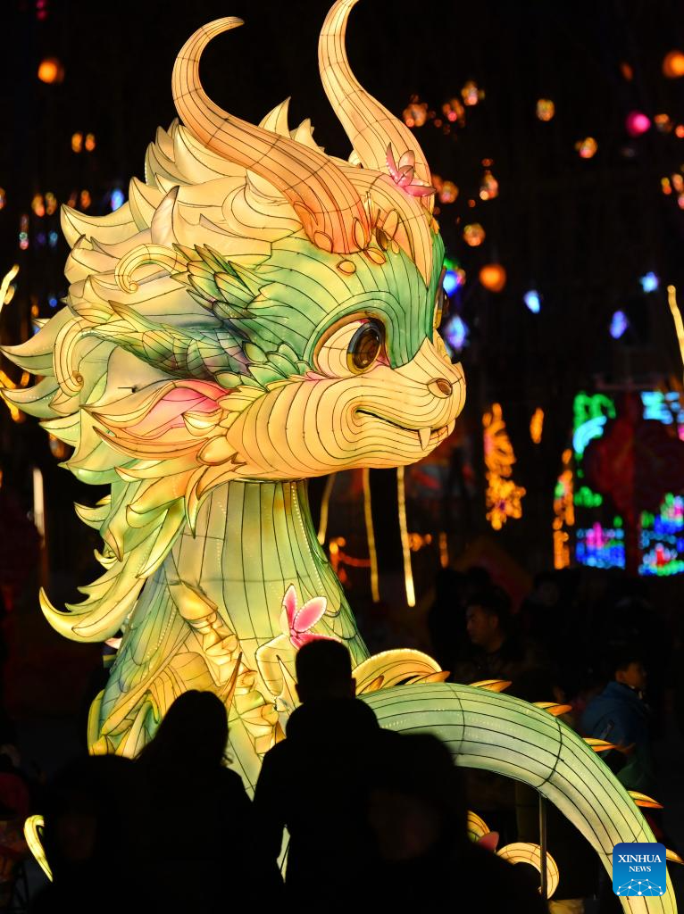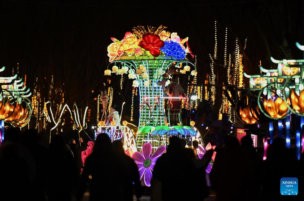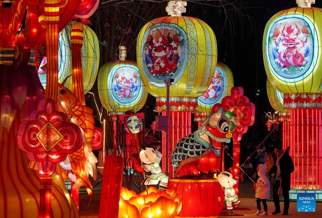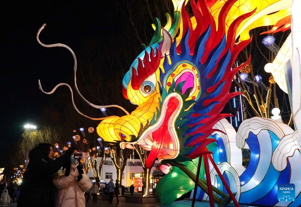 People visit a lantern show to celebrate the coming Spring Festival in Qinhuangdao, north China's Hebei Province, Feb. 7, 2024. Many Chinese cities are adorned with illuminated lanterns as Spring Festival is around the corner. (Xinhua/Yang Shiyao)