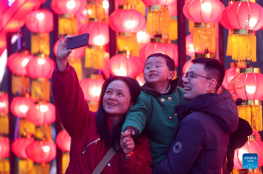 People take a selfie at a lantern show to celebrate the coming Spring Festival in Deqing County, east China's Zhejiang Province, Feb. 7, 2024. Many Chinese cities are adorned with illuminated lanterns as Spring Festival is around the corner. (Photo by Xie Shangguo/Xinhua)