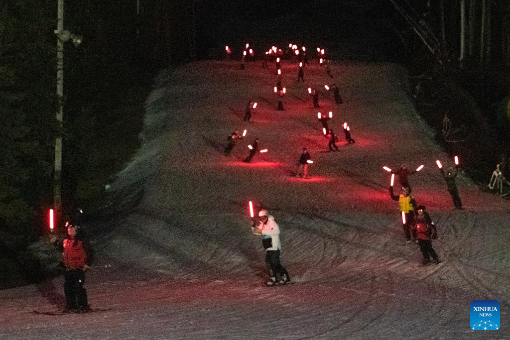 A torchlight parade resembling a "snaking dragon" illuminates the slopes of Camelback Mountain in Tannersville, the U.S. state of Pennsylvania, on Feb. 6, 2024. (Photo by Yu Zheng/Xinhua)