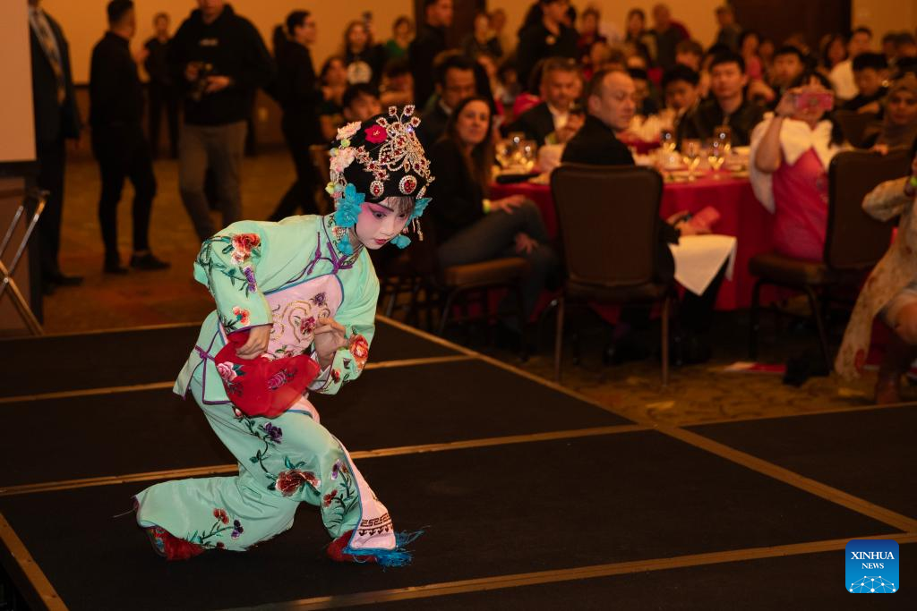 Niu Shanjinmei, a nine-year-old Beijing Opera actress, performs at the Camelback Resort in Tannersville, the U.S. state of Pennsylvania, on Feb. 6, 2024. (Photo by Yu Zheng/Xinhua)