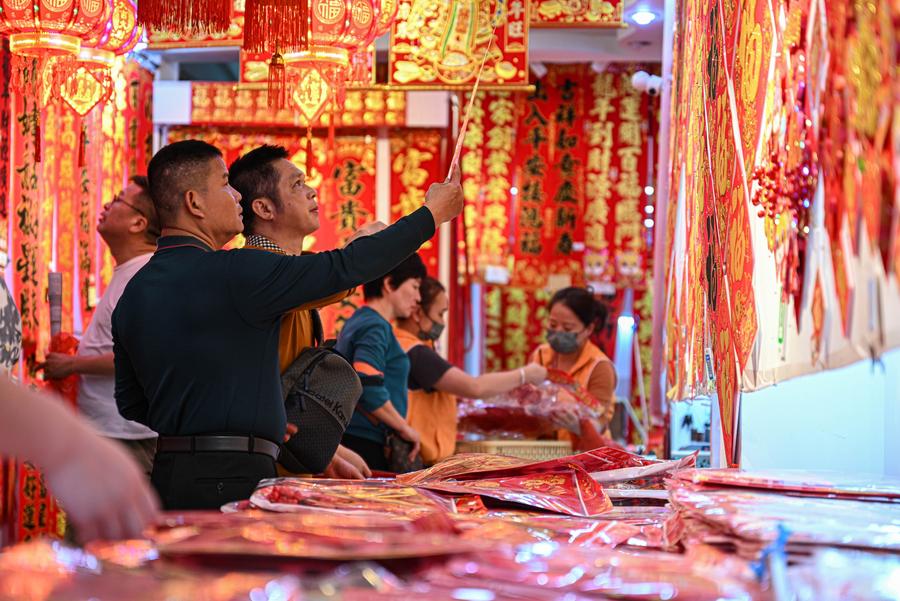 People shop for Spring Festival couplets at a local market for the upcoming Chinese New Year in Haikou, south China's Hainan Province, Feb. 6, 2024. (Xinhua/Pu Xiaoxu)