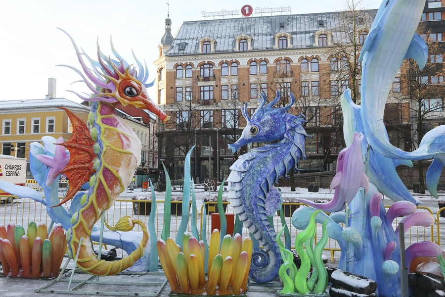 This photo taken on Jan. 27, 2024 shows some ice lanterns displayed in Oslo, capital of Norway. (Photo by Chen Yaqin/Xinhua)