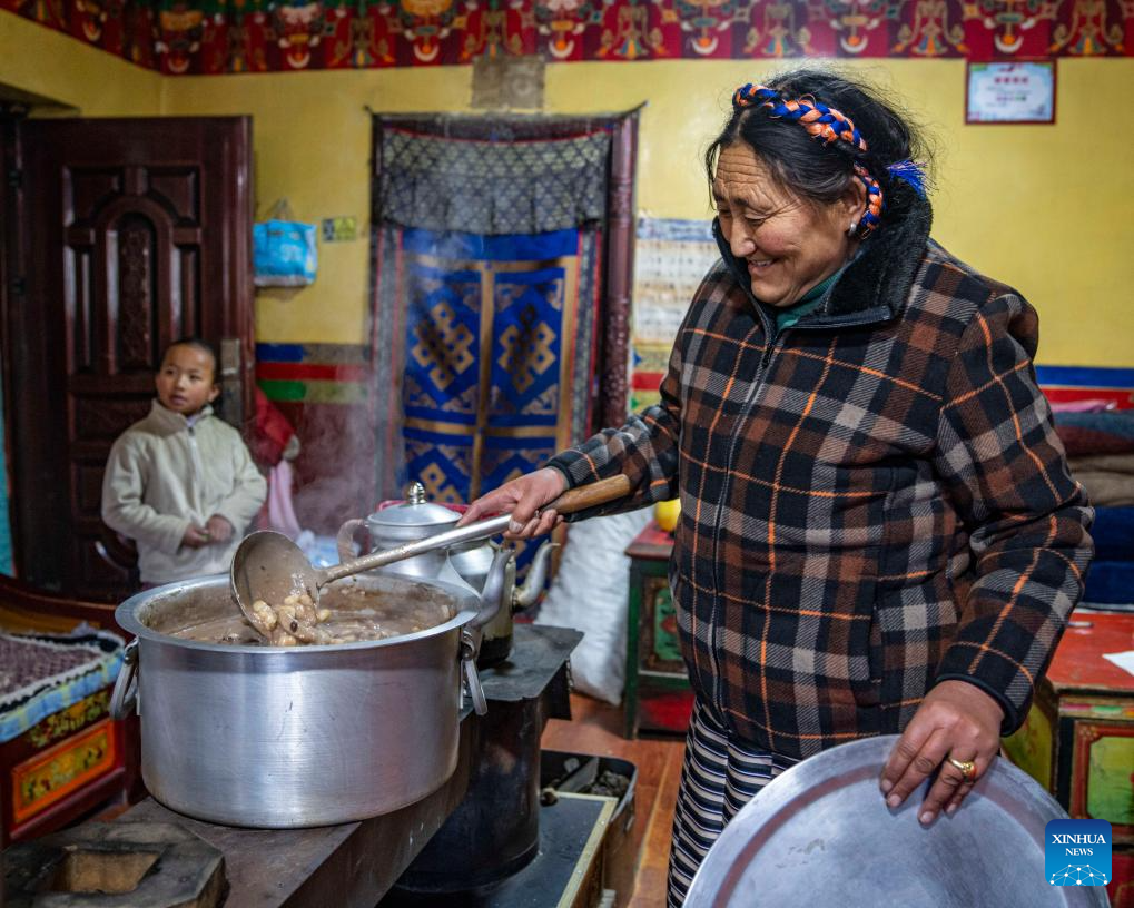 As the festival approaches, the village is exuding a cheerful and festive atmosphere. Like other locals, family members of Sichod Wangmo also gathered at home and enjoyed the feast, looking forward to having better days in the upcoming year. (Xinhua/Sun Fei)