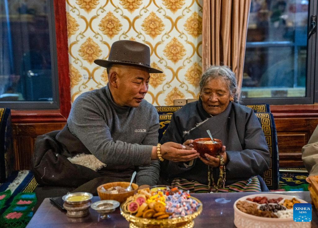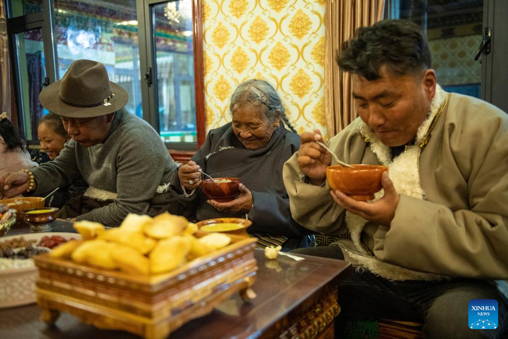 Sichod Wangmo has "gutu" at home in Damxung County, southwest China's Xizang Autonomous Region, Feb. 8, 2024.