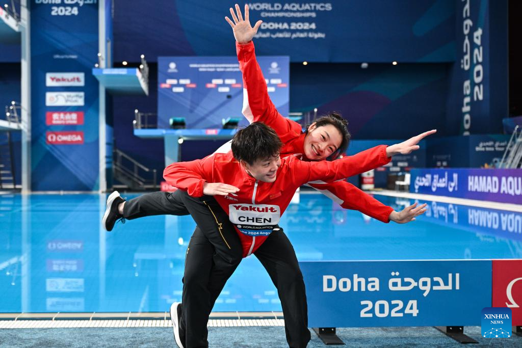 Chang Yani (rear) and Chen Yiwen of China celebrate after the women's 3m springboard final of the World Aquatics Championships 2024 in Doha, Qatar on Feb. 9, 2024. (Xinhua/Du Yu)