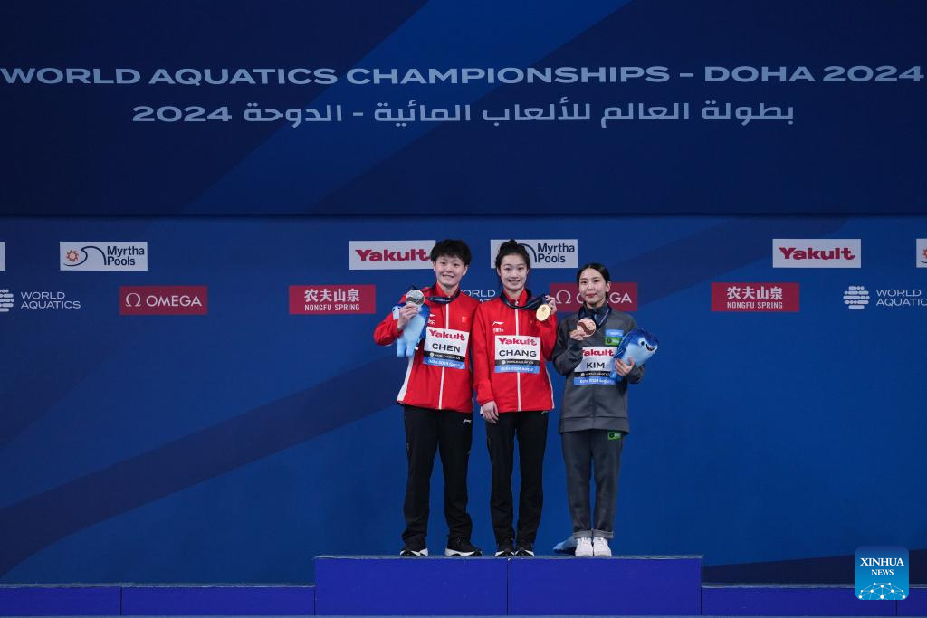 Gold medalist Chang Yani (C) of China, silver medalist Chen Yiwen (L) of China, bronze medalist Kim Suji of South Korea pose for photos during the awarding ceremony for the women's 3m springboard final of the World Aquatics Championships 2024 in Doha, Qatar on Feb. 9, 2024. (Xinhua/Du Yu)