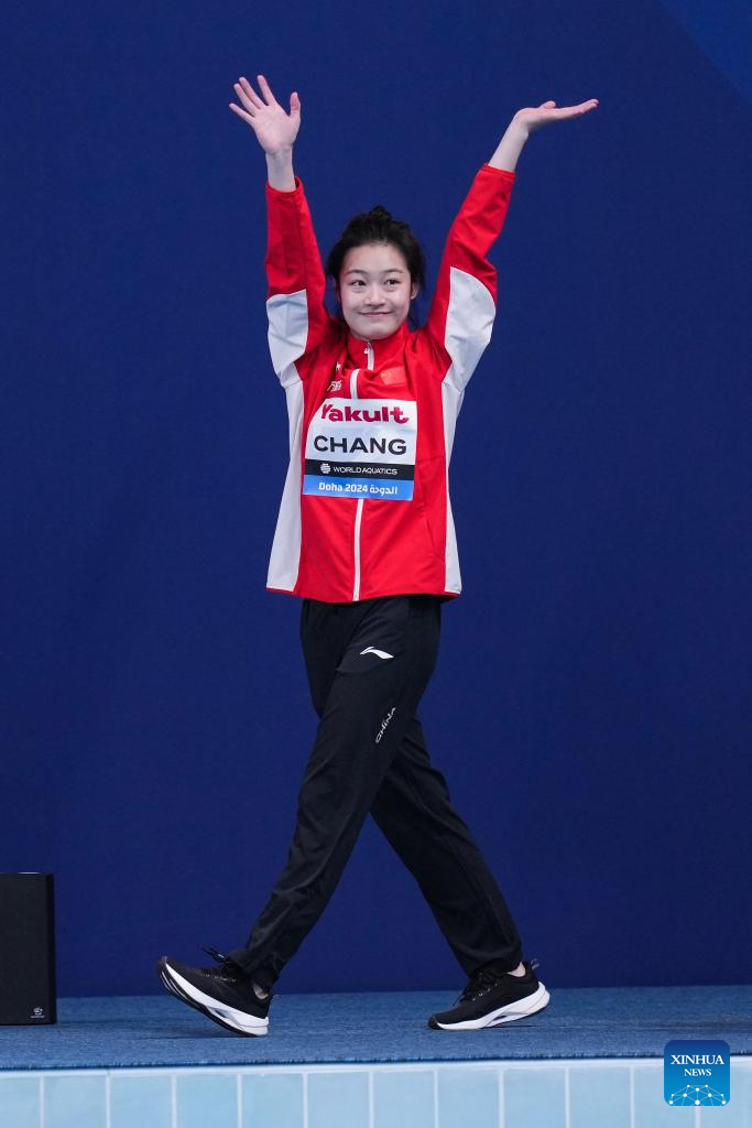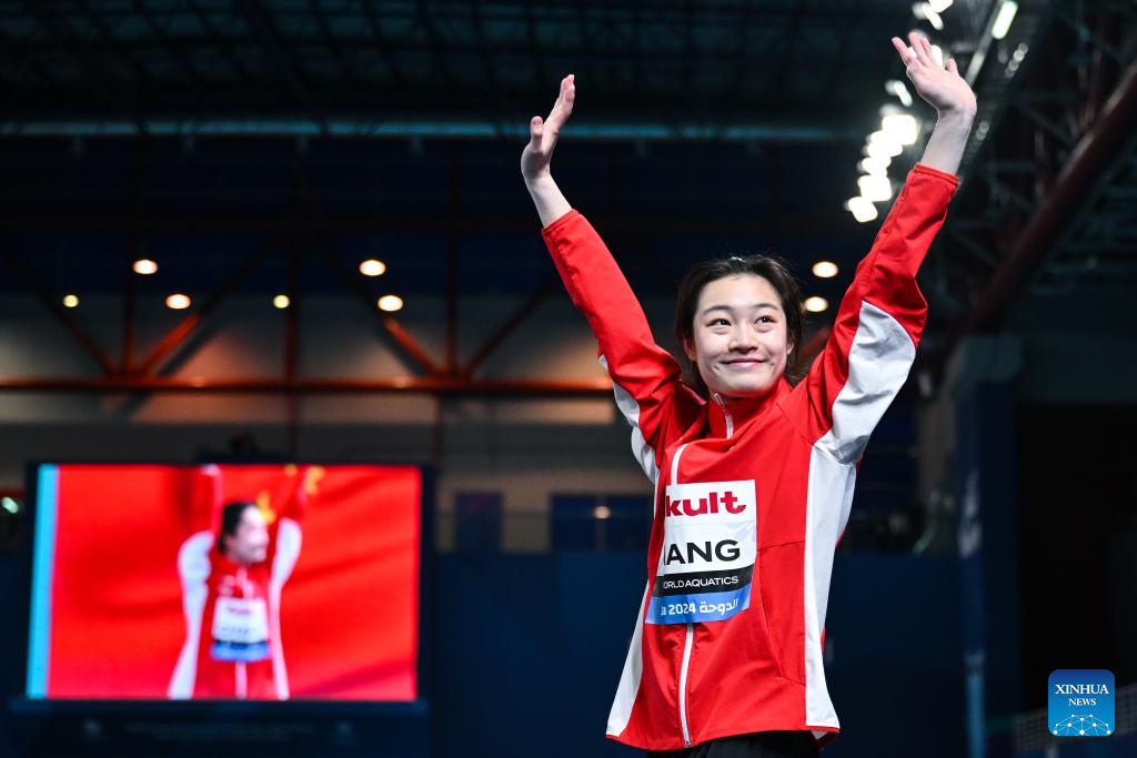 Chang Yani of China greets spectators prior to the women's 3m springboard final of the World Aquatics Championships 2024 in Doha, Qatar on Feb. 9, 2024. (Xinhua/Du Yu)