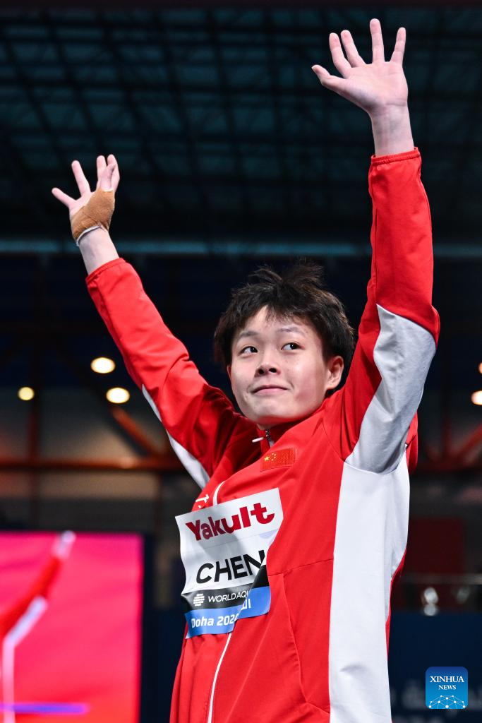 Chen Yiwen of China greets spectators prior to the women's 3m springboard final of the World Aquatics Championships 2024 in Doha, Qatar on Feb. 9, 2024. (Xinhua/Du Yu)