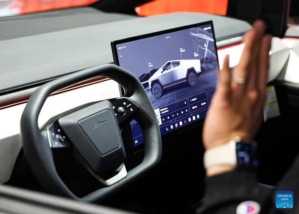This photo taken on Feb. 8, 2024 shows the dashboard of a Tesla Cybertruck at the 2024 Chicago Auto Show at McCormick Place in Chicago, the United States. The 2024 Chicago Auto Show featuring 20-plus manufacturers from all over the world will last from Feb. 10 to 19. (Photo by Joel Lerner/Xinhua)