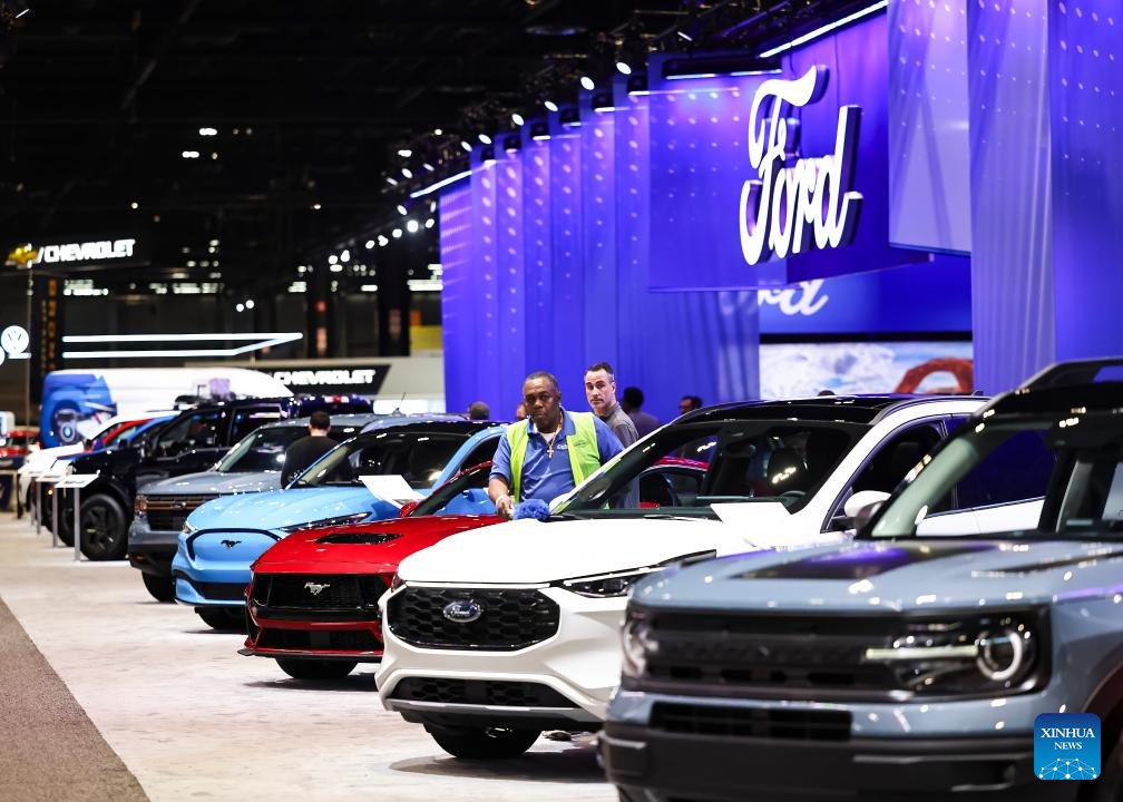 This photo taken on Feb. 8, 2024 shows the Ford lineup at the 2024 Chicago Auto Show at McCormick Place in Chicago, the United States. The 2024 Chicago Auto Show featuring 20-plus manufacturers from all over the world will last from Feb. 10 to 19. (Photo by Joel Lerner/Xinhua)