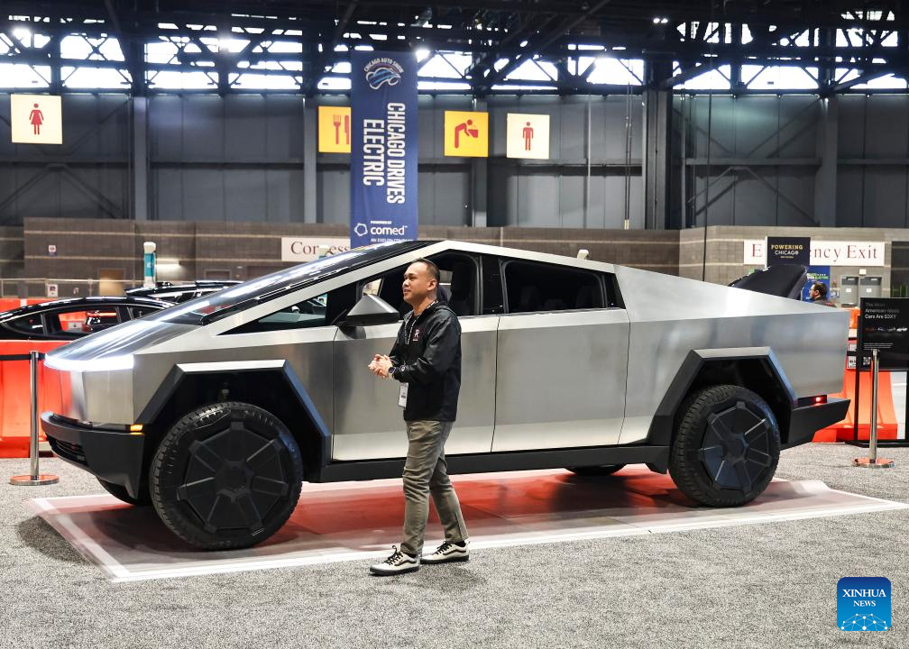 This photo taken on Feb. 8, 2024 shows a Tesla Cybertruck at the 2024 Chicago Auto Show at McCormick Place in Chicago, the United States. The 2024 Chicago Auto Show featuring 20-plus manufacturers from all over the world will last from Feb. 10 to 19. (Photo by Joel Lerner/Xinhua)
