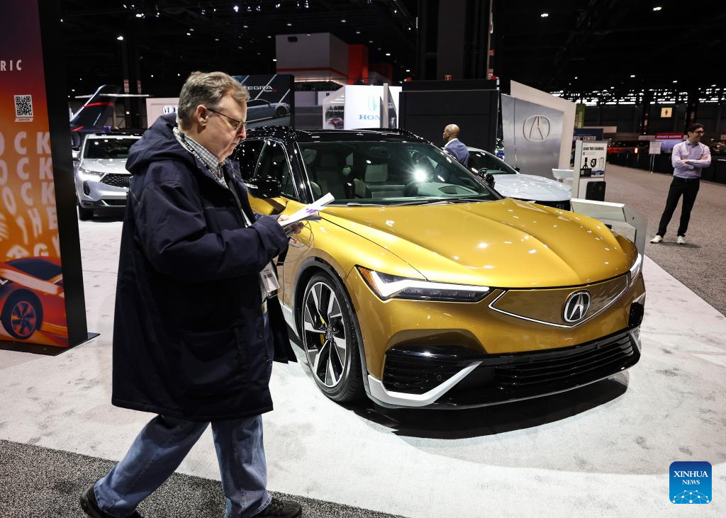 This photo taken on Feb. 8, 2024 shows a media member walking past an all electric Acura ZDX Turbo Type S at the 2024 Chicago Auto Show at McCormick Place in Chicago, the United States. The 2024 Chicago Auto Show featuring 20-plus manufacturers from all over the world will last from Feb. 10 to 19. (Photo by Joel Lerner/Xinhua)