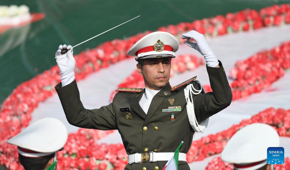 A military band performs during a rally to celebrate the 45th anniversary of the victory of Iran's 1979 Islamic Revolution in Tehran, Iran, Feb. 11, 2024. (Xinhua/Shadati)