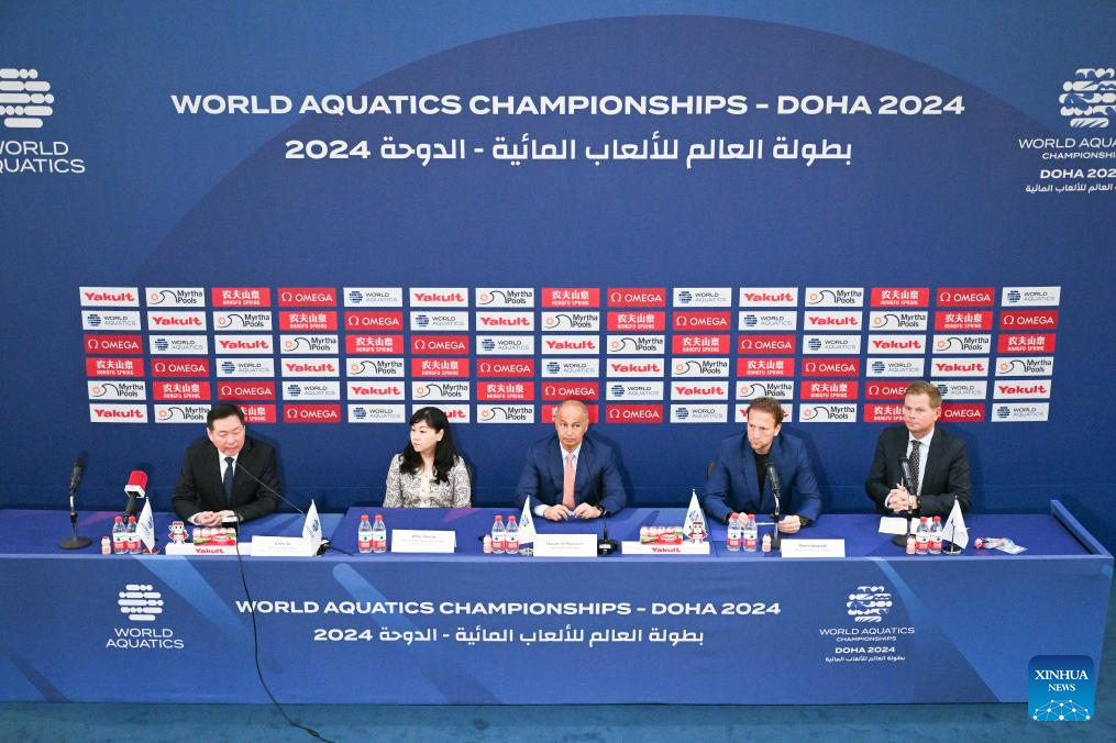 Deputy Director General of the Beijing Municipal Bureau of Sports Chen Jie (1st L) speaks during a press conference held by World Aquatics in Doha, Qatar, Feb. 11, 2024. World Aquatics confirmed on Sunday that the Chinese capital, Beijing, will host the World Aquatics Championships in 2029. (Xinhua/Xia Yifang)