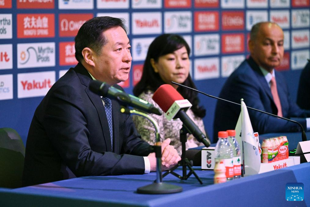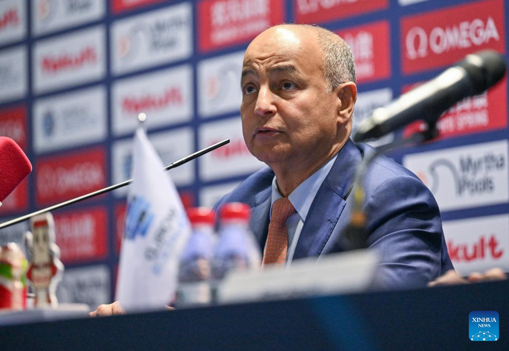 World Aquatics President Husain Al Musallam attends a press conference held by World Aquatics in Doha, Qatar, Feb. 11, 2024. World Aquatics confirmed on Sunday that the Chinese capital, Beijing, will host the World Aquatics Championships in 2029. (Xinhua/Xia Yifang)