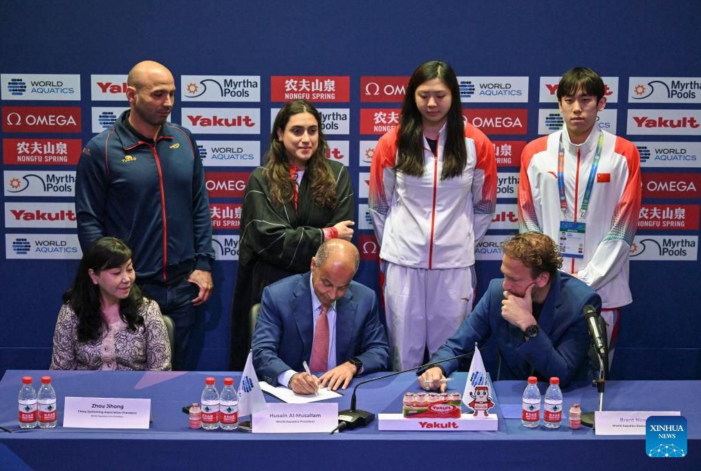 World Aquatics President Husain Al Musallam (C, down) attends a signing ceremony held by World Aquatics in Doha, Qatar, Feb. 11, 2024. World Aquatics confirmed on Sunday that the Chinese capital, Beijing, will host the World Aquatics Championships in 2029. (Xinhua/Xia Yifang)