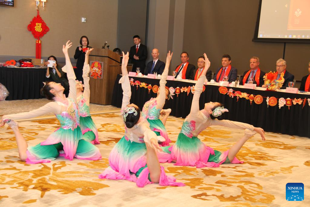 Students of the High School Affiliated to Renmin University of China stage a dance during an event to celebrate Chinese Lunar New Year in Muscatine, Iowa, the United States, Feb. 9, 2024. (Xinhua/Xu Jing)