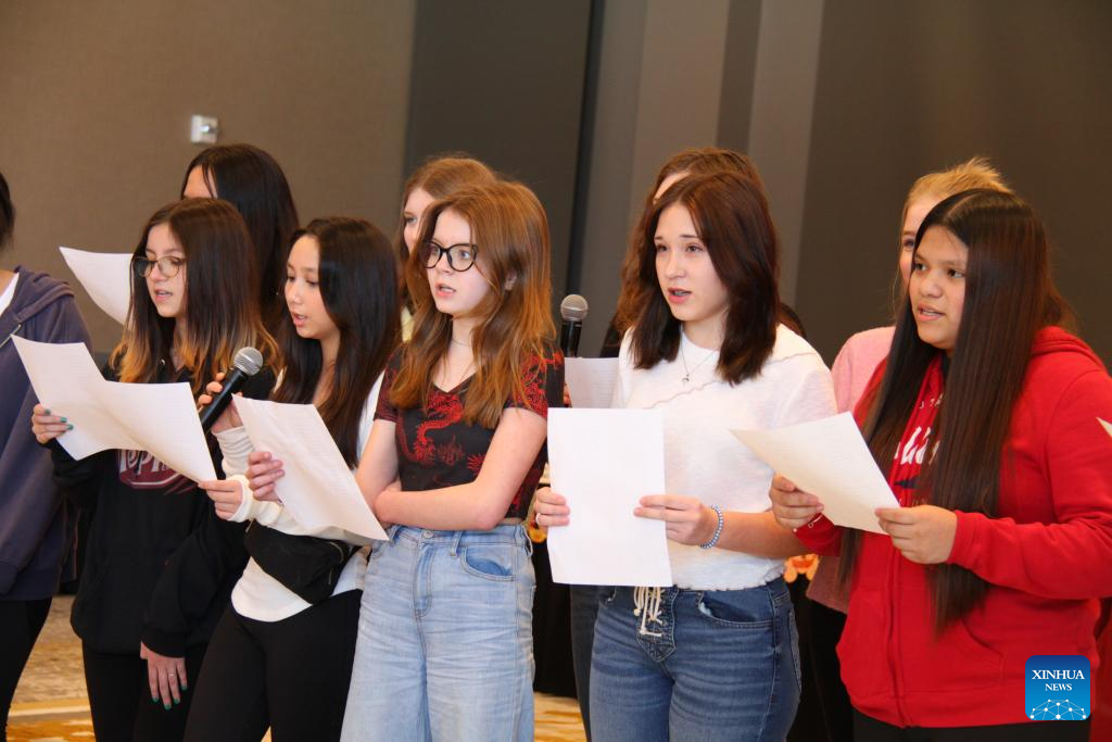American students sing a Chinese song during an event to celebrate Chinese Lunar New Year in Muscatine, Iowa, the United States, Feb. 9, 2024. (Xinhua/Xu Jing)